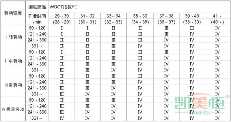 《工作場所職業病有害因素作業分級高溫》(GBZ/T229.3—2010)根據WBGT(濕球黑球溫度)指數和接觸高溫作業時間進行分級(見下表)。
