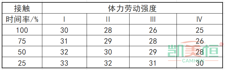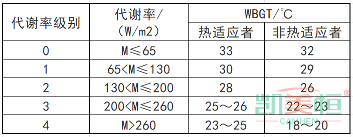 《熱環境根據WGBT指數(濕球黑球溫度)對工作人員熱負荷的評價》(GB/T17244—1998)等效采用ISO7243的高溫作業衛生標準,如下表所示。